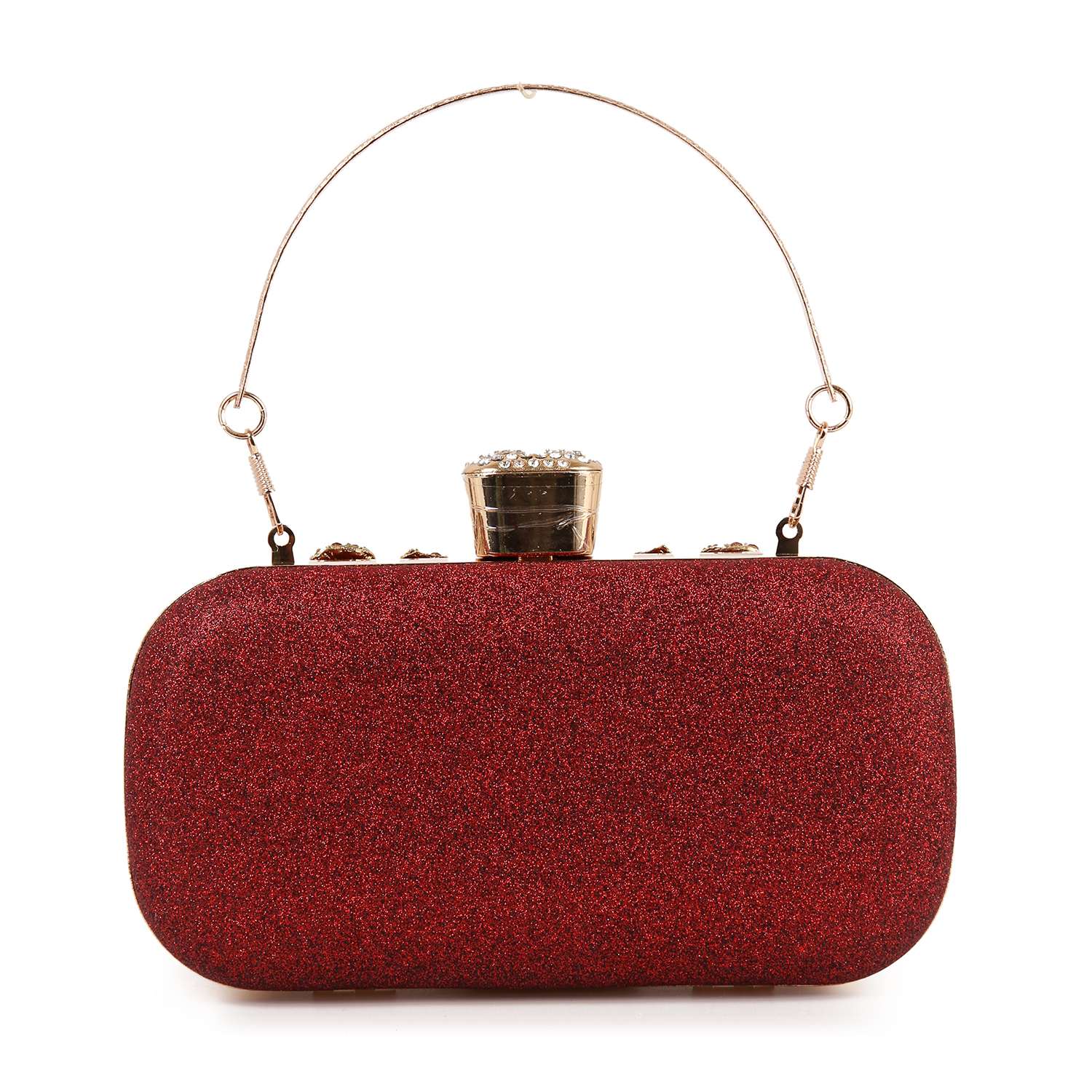 Mesmerizing stones in a retro floral pattern shine across an evening bag that is finished with a metal handle.  This is what you wear when you want to be noticed! 4L detachable single handle. 22L detachable chain strap. Faux leather with lined interior. Top clasp closure. Gold toned hardware.   ...