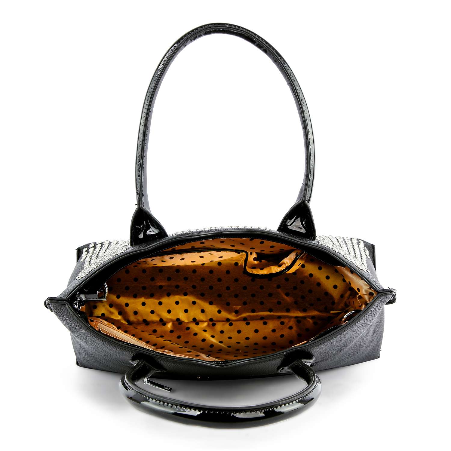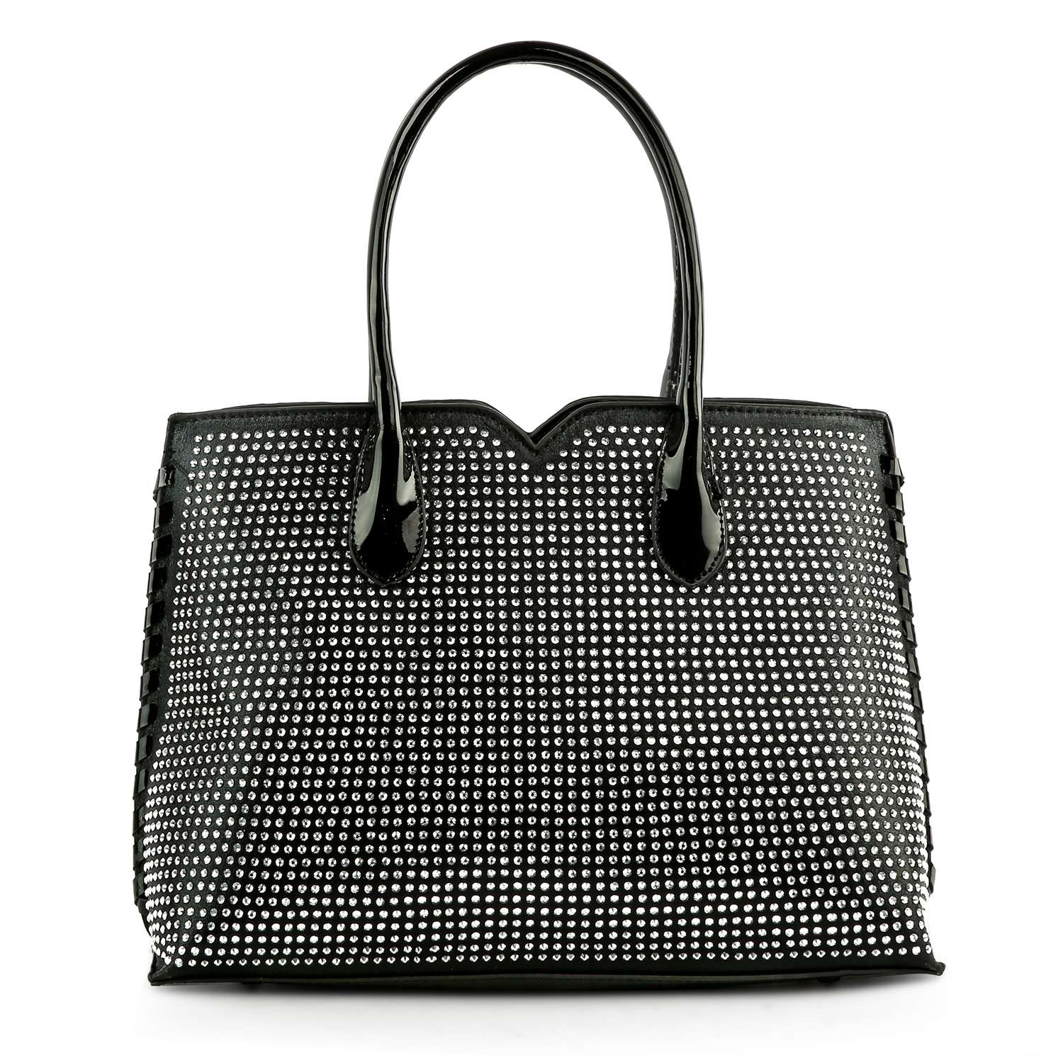 This versatile tote manages it all effortlessly with patent trim and a rhinestone covered front for a stylish look!   * 1 back zip pocket. * 6.5L double handles; 22L detachable strap. * Faux leather with lined interior. * 2 interior slip pockets & 1 zip pocket. * Top zip...
