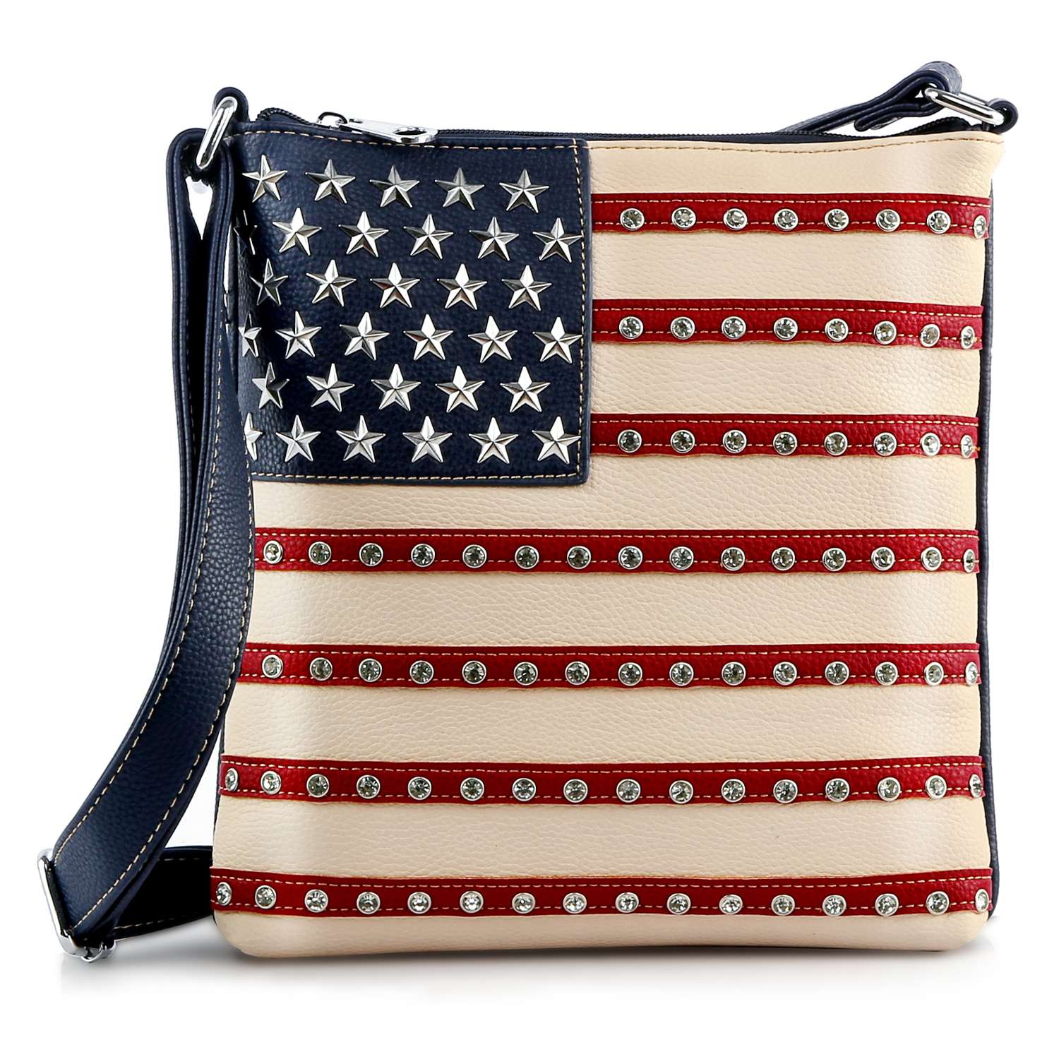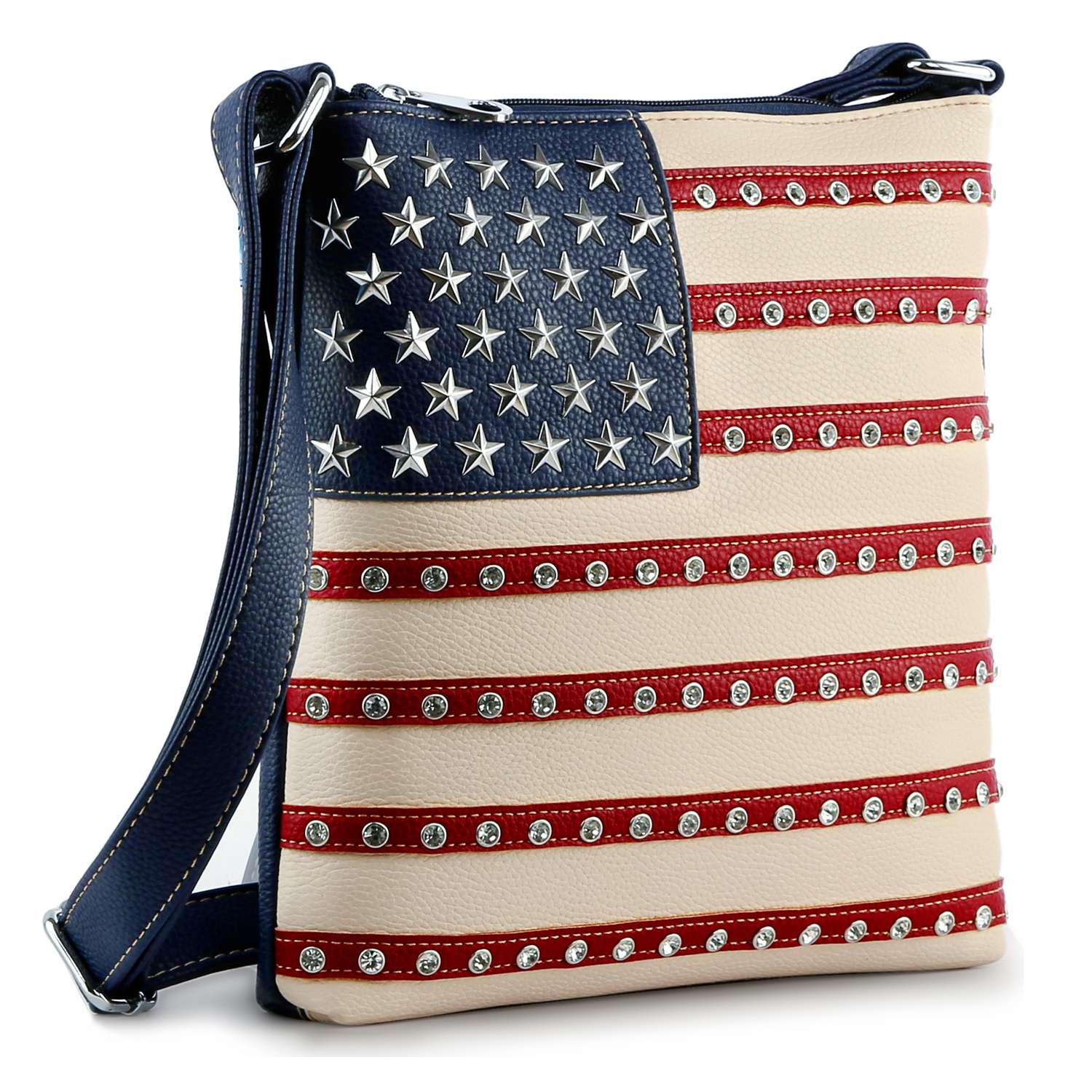 A super convenient crossbody sling becomes a globetrotter, paying homage to the USA with a dazzling stone and studded flag-inspired design.
