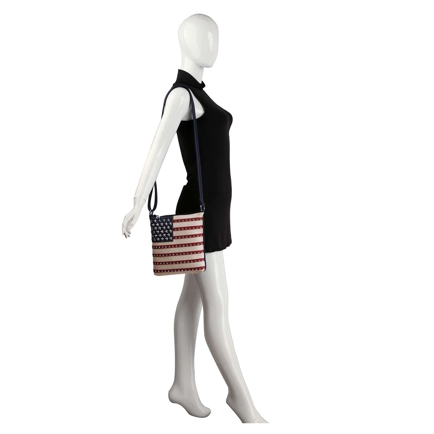 A super convenient crossbody sling becomes a globetrotter, paying homage to the USA with a dazzling stone and studded flag-inspired design.   1 back zip pocket. 22L adjustable strap. Faux leather with lined interior. 2 interior slip pockets and 1 zip pocket. Top zip closure. Silver hardware with metal stud...